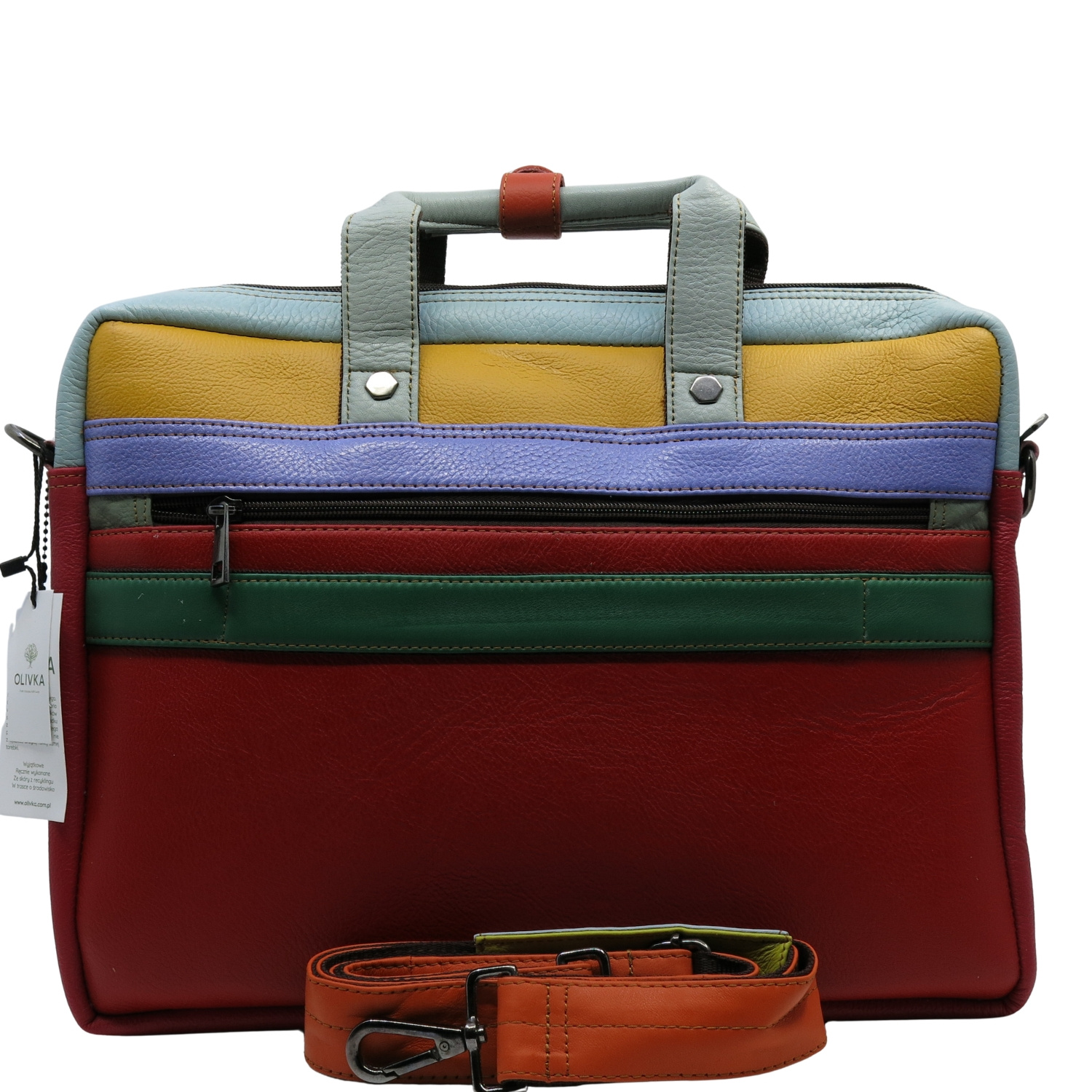 Aktówka jest przecudna i jedyna w swoim rodzaju. Pakowna,posiada wiele przydatnych kieszonek a kolory odważne,dodają uroku i całości:)