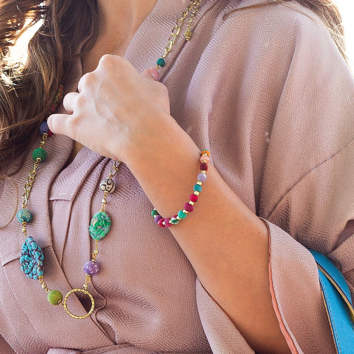 Biżuteria którą widzisz to nie tylko piękny dodatek. Każda sztuka została ręcznie wykonana z bawełny z recyklingu – pozyskanej z tradycyjnych hinduskich sari. Jest przyjazna środowisku – wykorzystuje odpady tekstylne i zmniejsza zużycie surowców. Unikatowa jak kobiety - rzemieślniczki, które ją dla Ciebie stworzyły bo każda sztuka jest niepowtarzalna. Zrównoważona moda to nie tylko trend, lecz konieczność dla dobra planety - świadome wybory wspierają pozytywne zmiany w branży modowej i chronią środowisko. Twój zakup ma znaczenie. Wzmacnia finansowo pozycję kobiet, wspiera ich rodziny i daje nadzieję na trwałą zmianę.