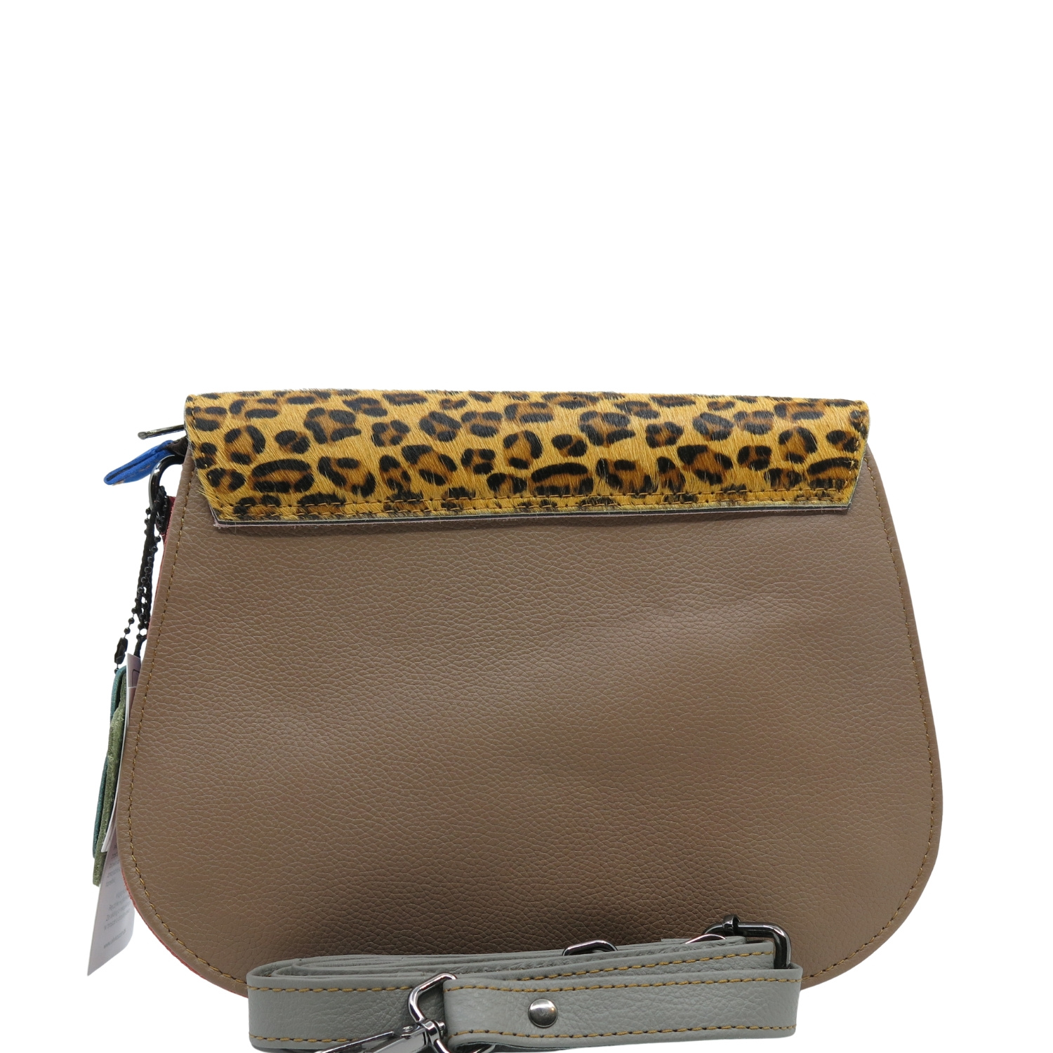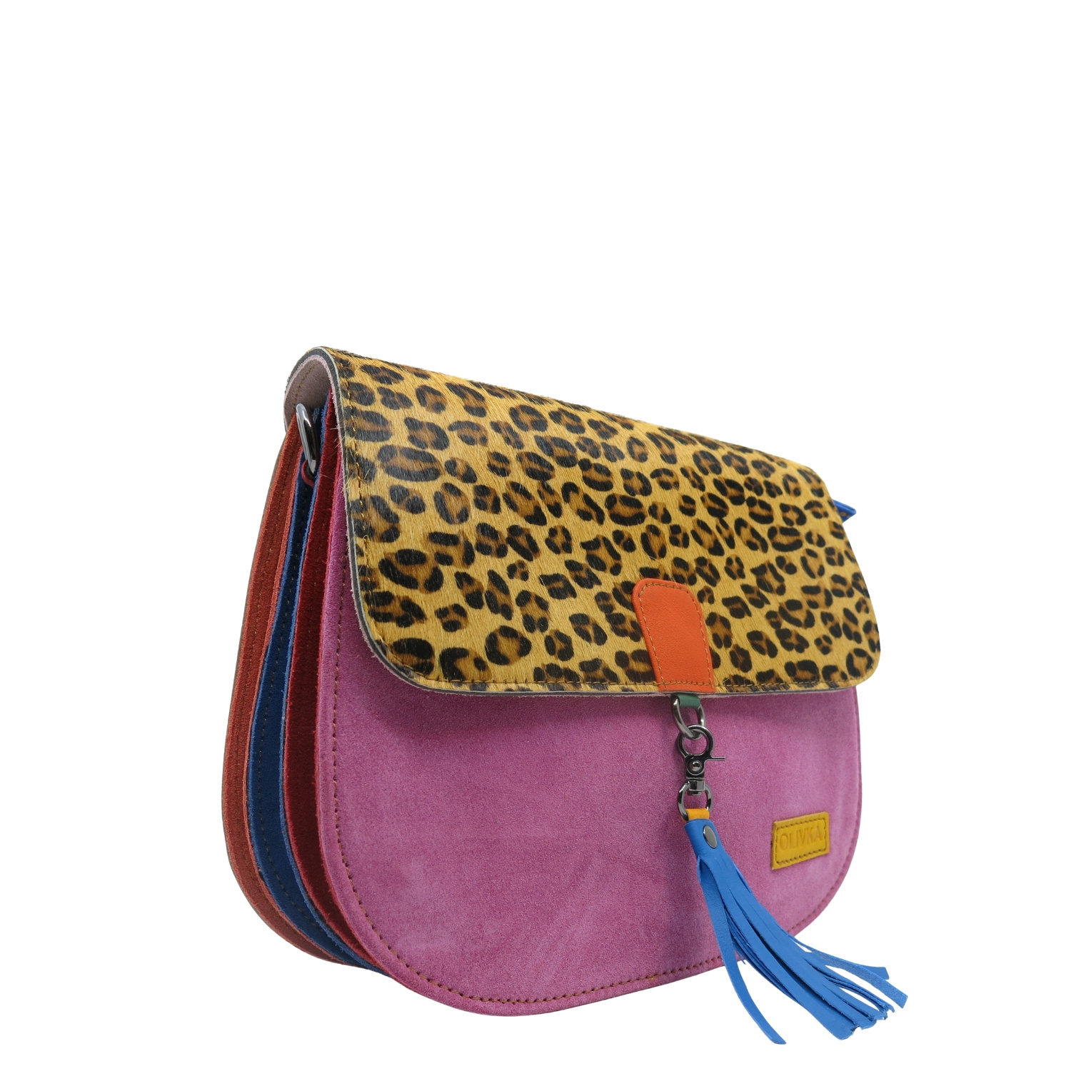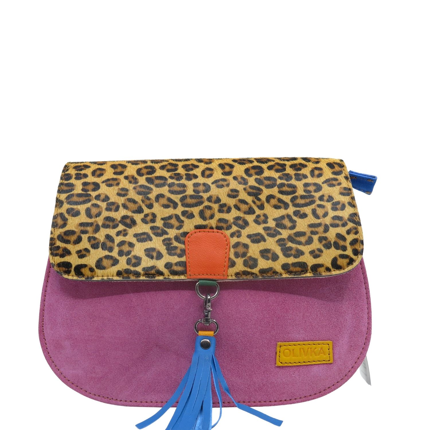 - skórzana klapka z naturalnym włosiem ozdobiona nadrukiem