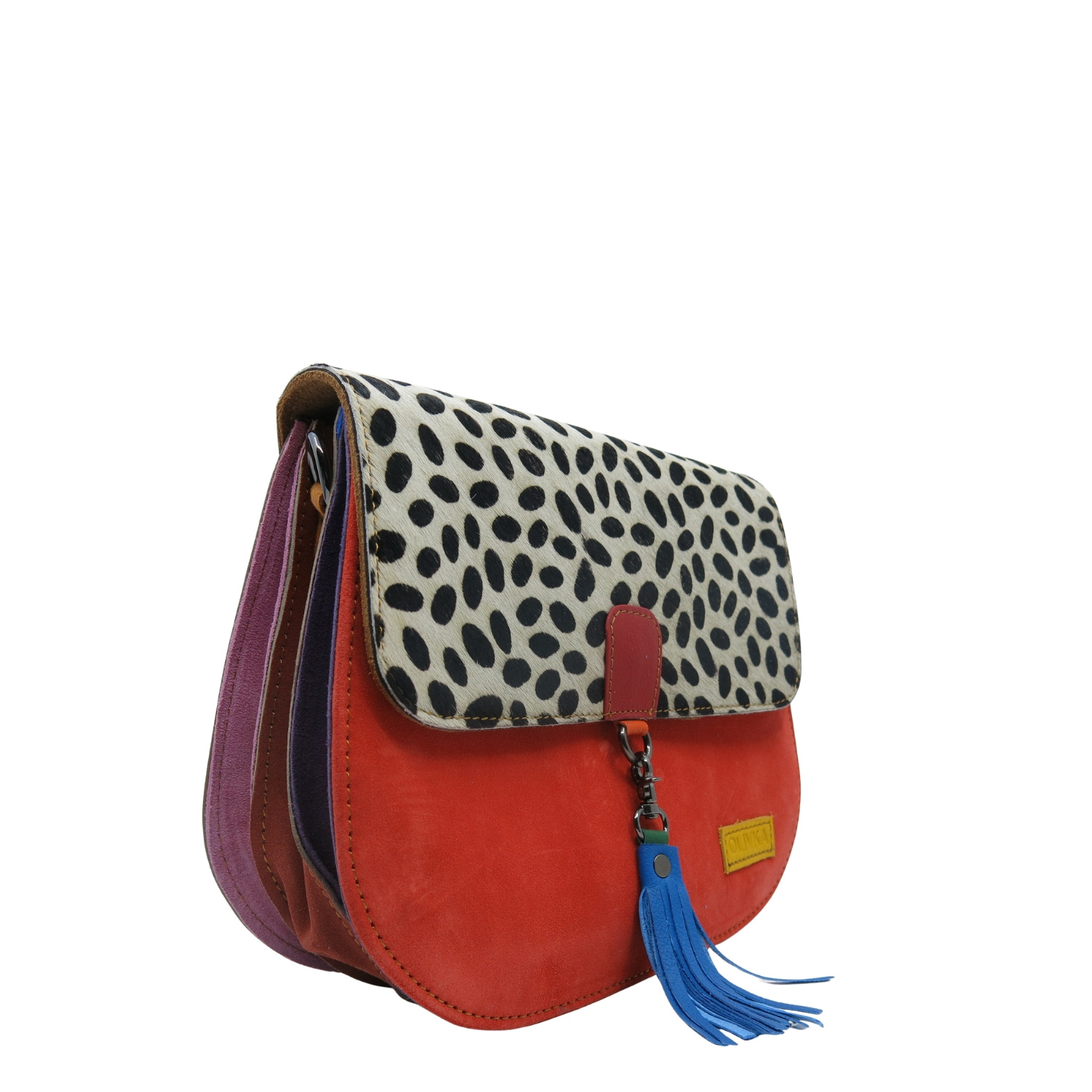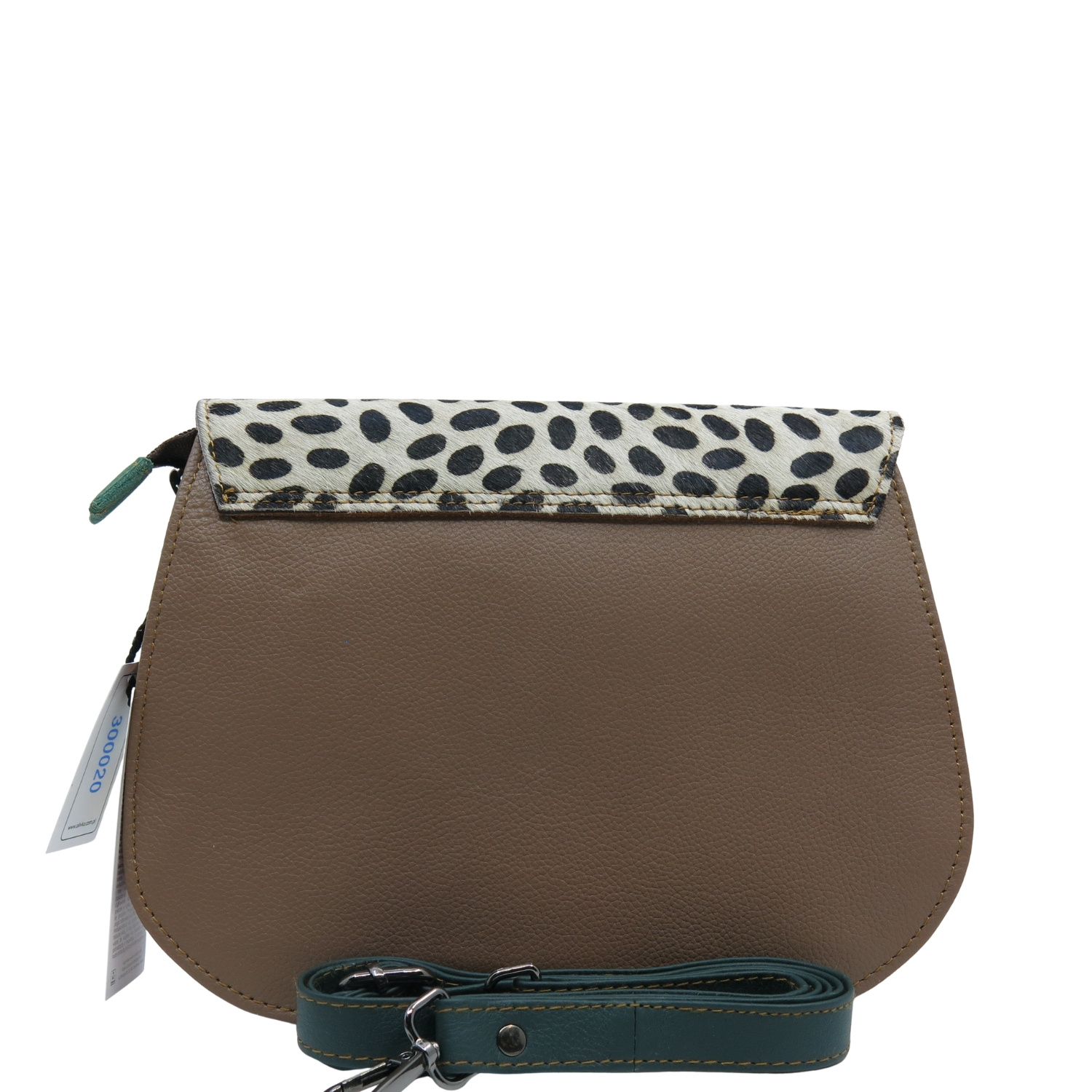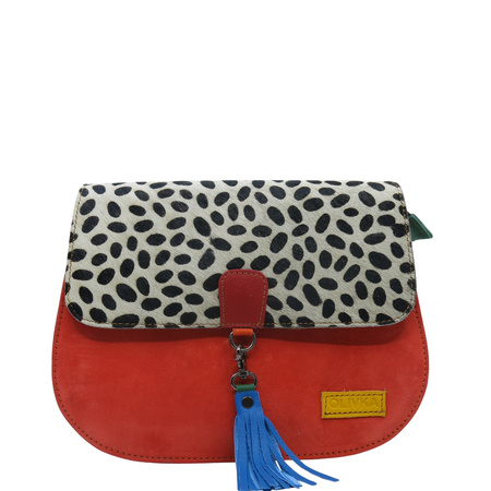- skórzana klapka z naturalnym włosiem ozdobiona nadrukiem